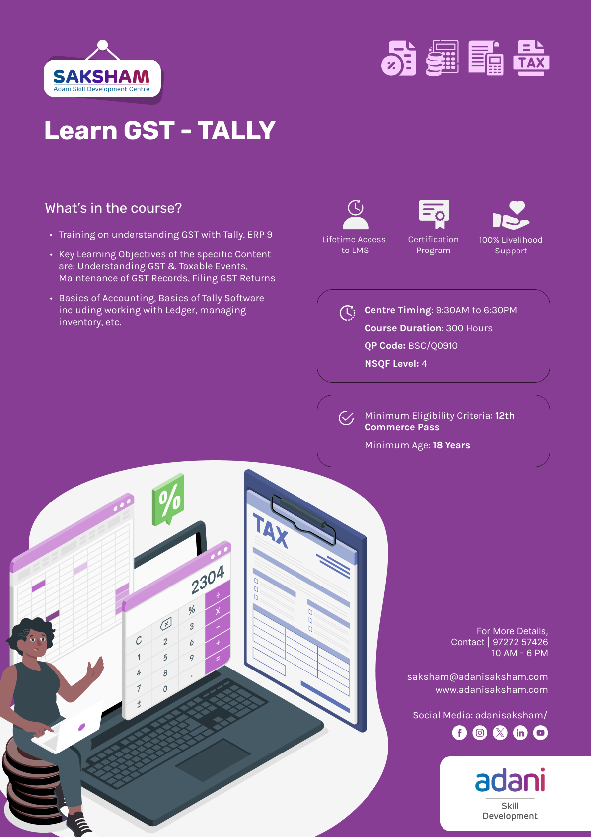 Course Overview The GST–Tally program provides a detailed understanding of GST procedures and digital accounting through Tally ERP 9. The course focuses on building practical competence in managing ledgers, handling transactions, preparing records and ensuring compliance with GST norms. Participants work directly on Tally to perform common accounting functions, giving them the confidence to support business operations from day one.